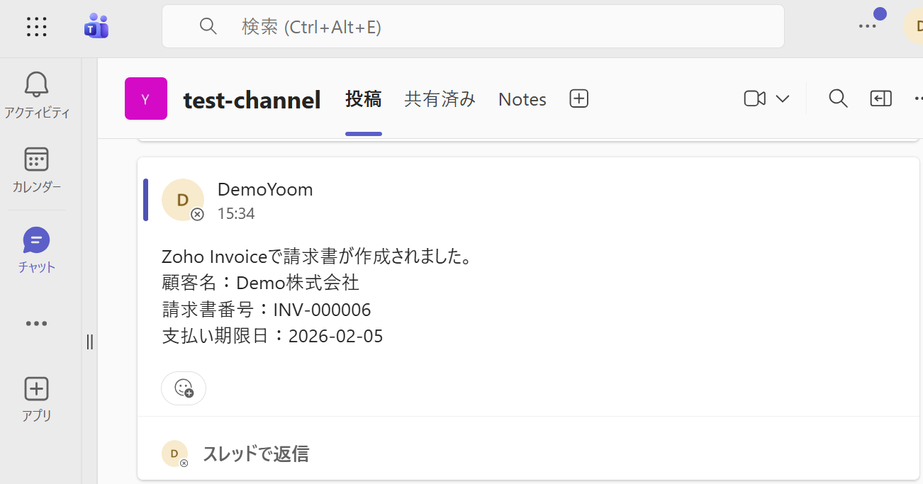 Zoho Invoiceの請求書情報が、Microsoft Teamsで通知されました!