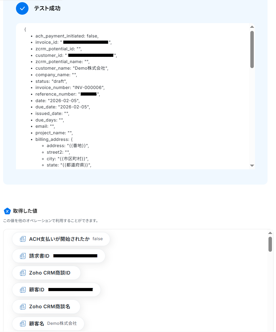 Typeformのトリガー設定では、起動の対象としたいフォームのIDやタグを任意で設定してください。これにより、特定のフォームが送信された時だけワークフローを起動させることが可能です。 Zoho Invoiceの請求書作成アクションでは、Typeformのフォームで取得した顧客や商品、金額などの値を引用し、請求書の各フィールドに自由に設定できます。 ■注意事項