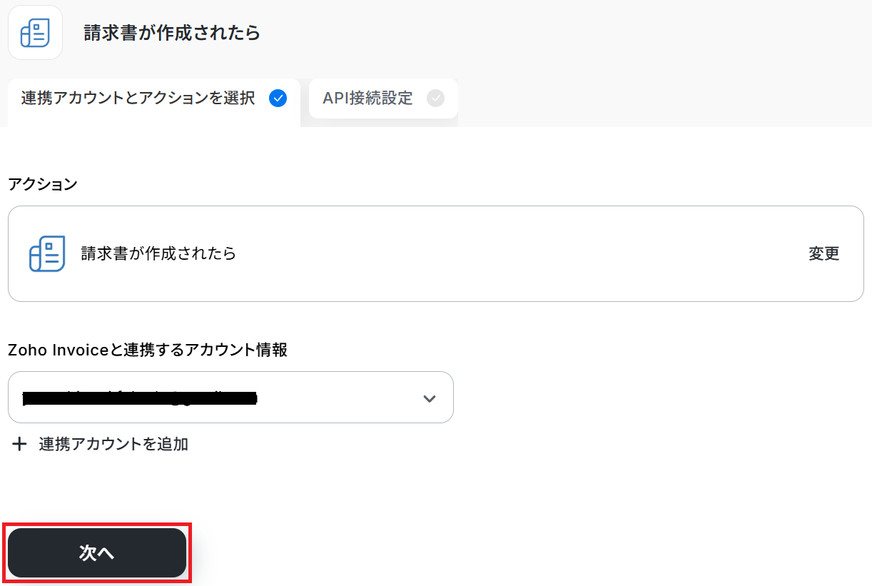 タイトル と連携するアカウント情報 を任意で設定し、アクションはテンプレート通りに「請求書が作成されたら」のまま「次へ」をクリックします。