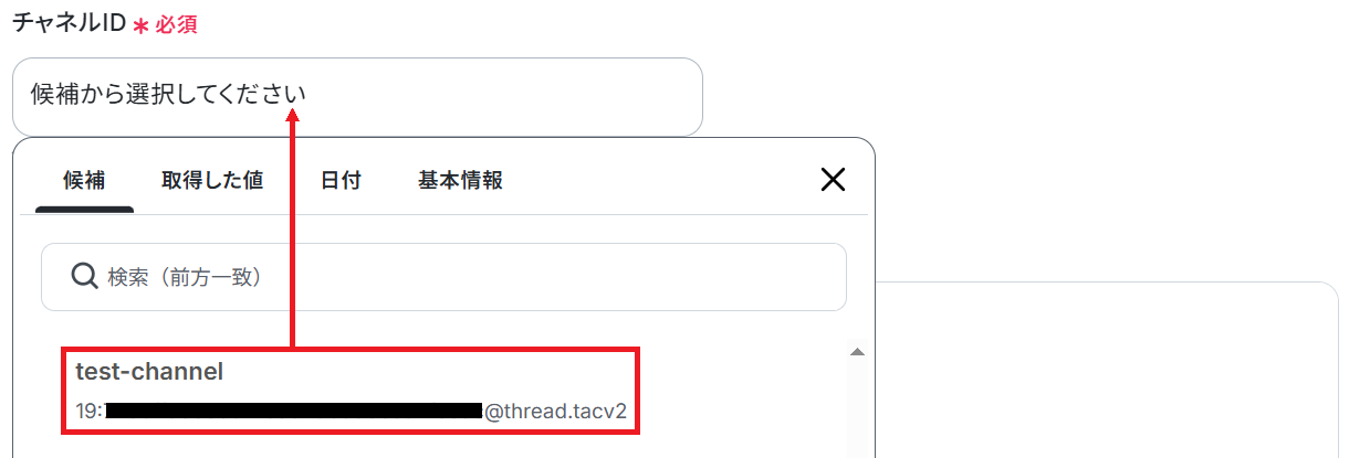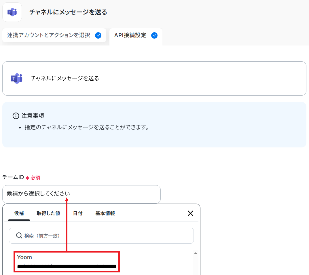 チームID を選択すると、その下のチャネルID に候補が表示されるようになります。 投稿するチャネルを選択してください。