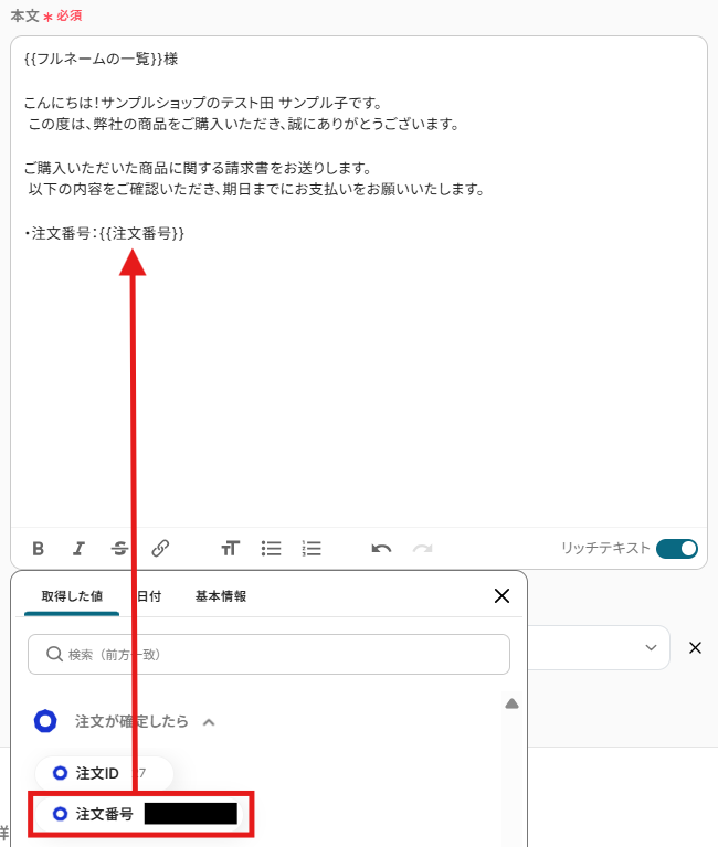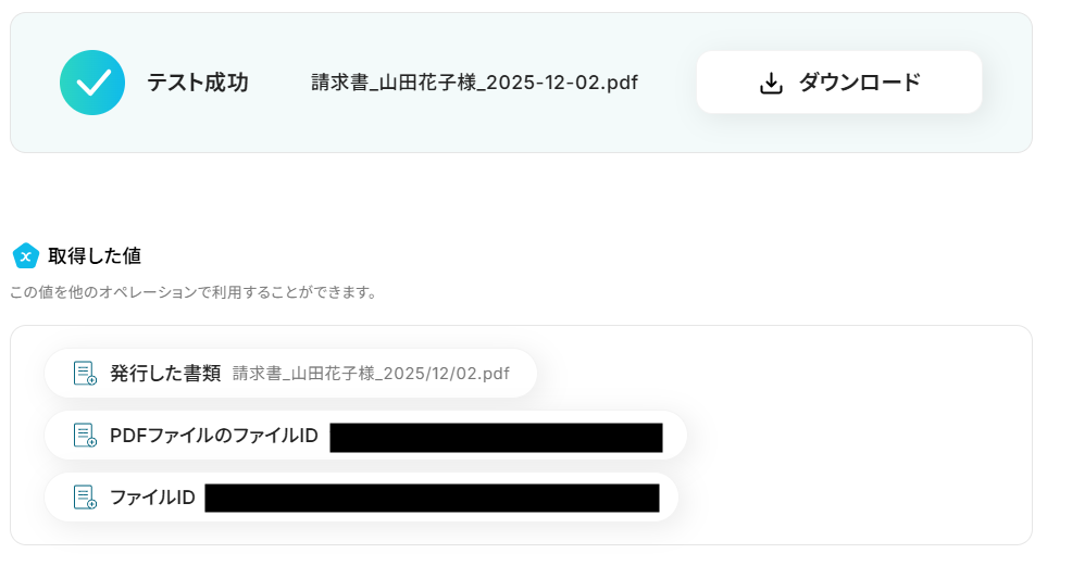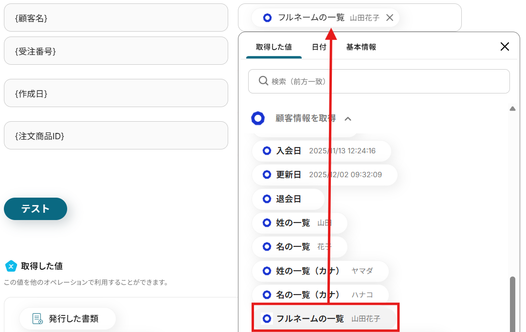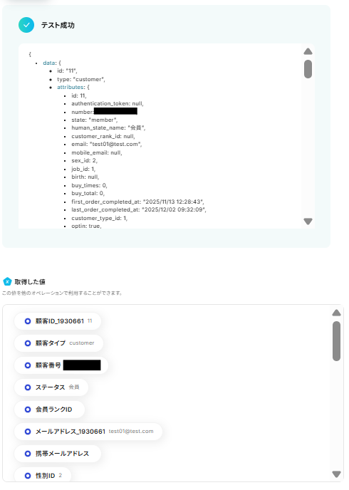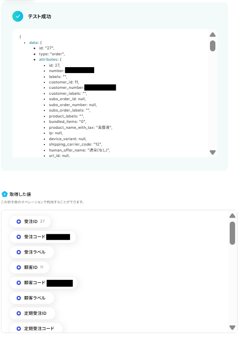 テストが成功すると取得した値の横に、ecforceで作成した受注の基本情報が表示されます。