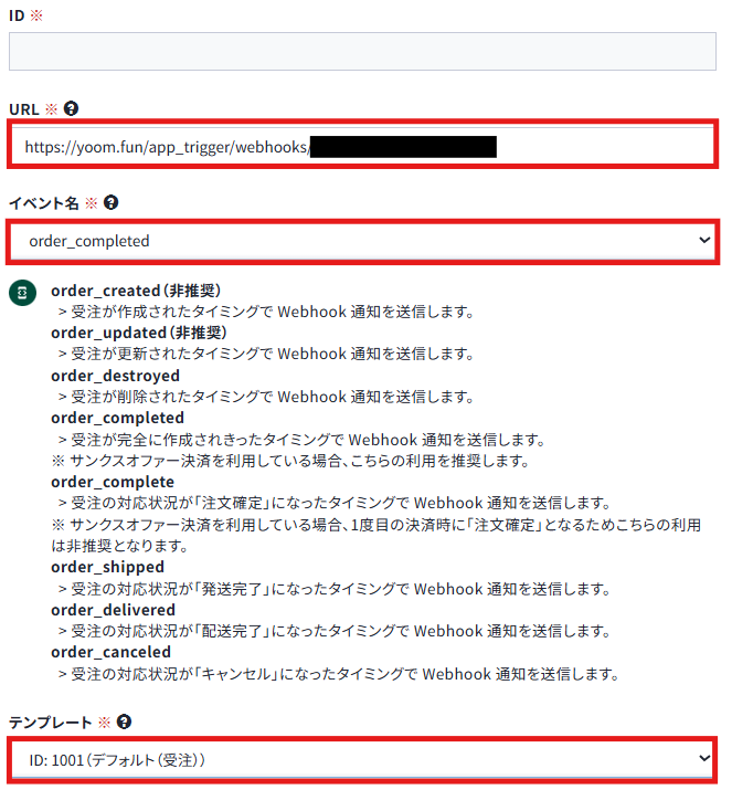Yoomの操作画面からコピーしてきた、Webhook URLを貼り付けてください。
