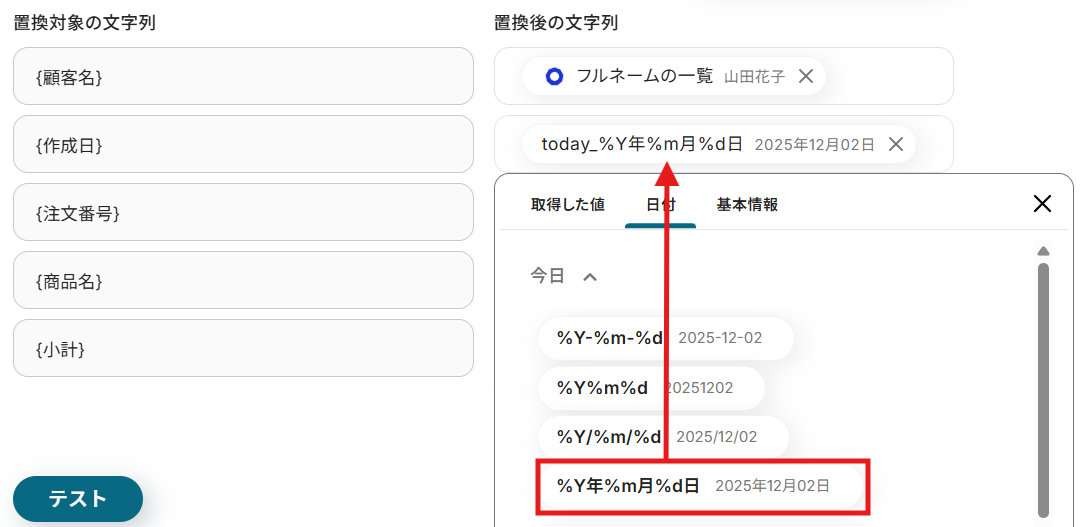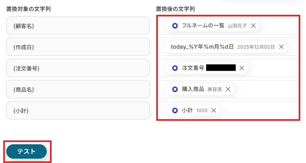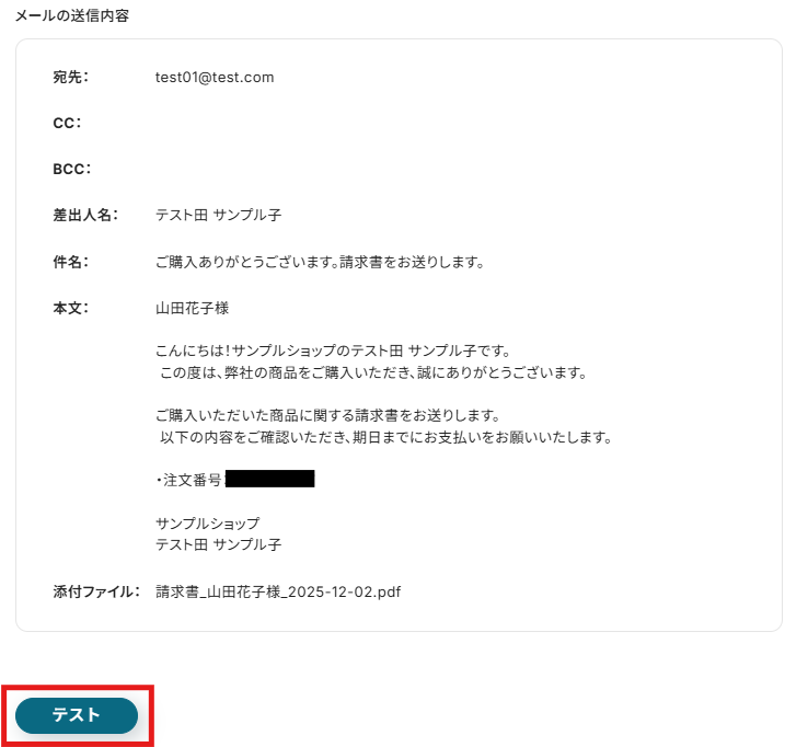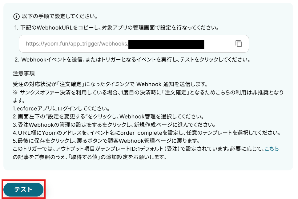 テスト用の受注を作成したら、Yoomの操作画面に戻り、「テスト」をクリックします。