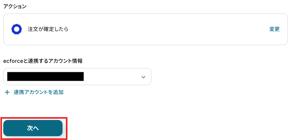 - 次に、トリガーでecforceを選択し、「注文が確定したら」というアクションを設定します。