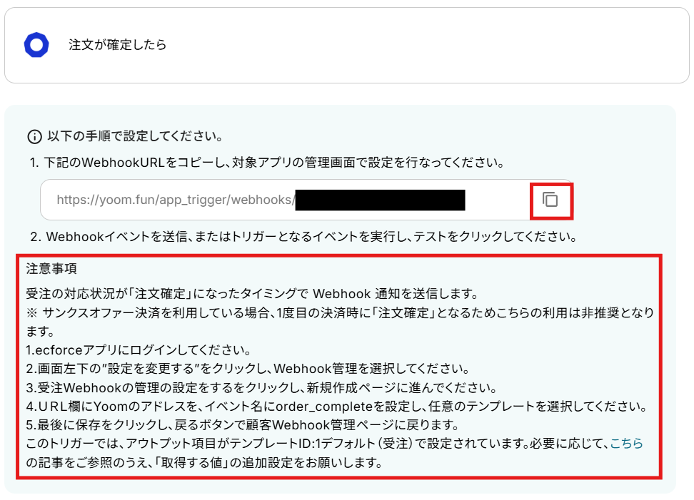 赤枠内のWebhook URLをコピーして、ecforceに移動してください。