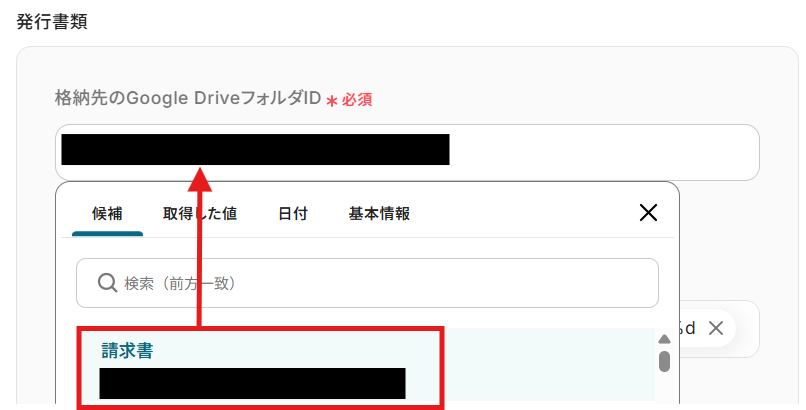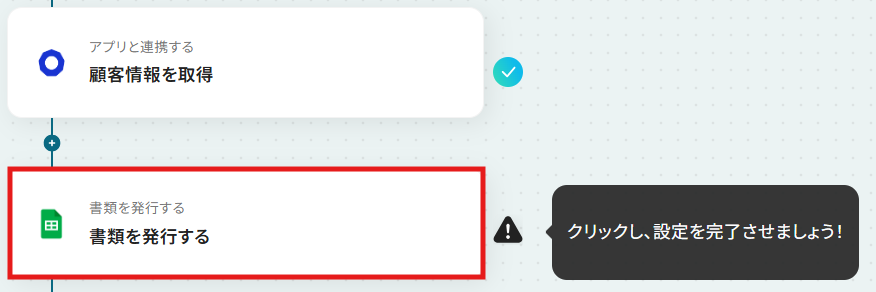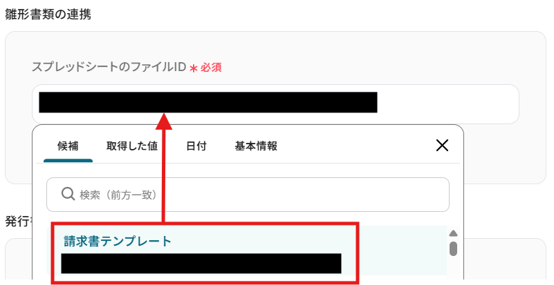 - 次に、オペレーションでGoogle スプレッドシートの「書類を発行する」アクションを設定し、取得した情報を元に請求書を作成します。