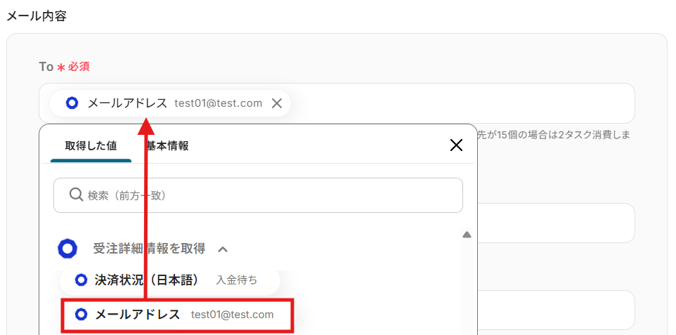 - 「メールを送る」オペレーションでは、送付先のメールアドレスや件名、本文の内容を、ecforceから取得した顧客情報などを活用して任意に設定できます。