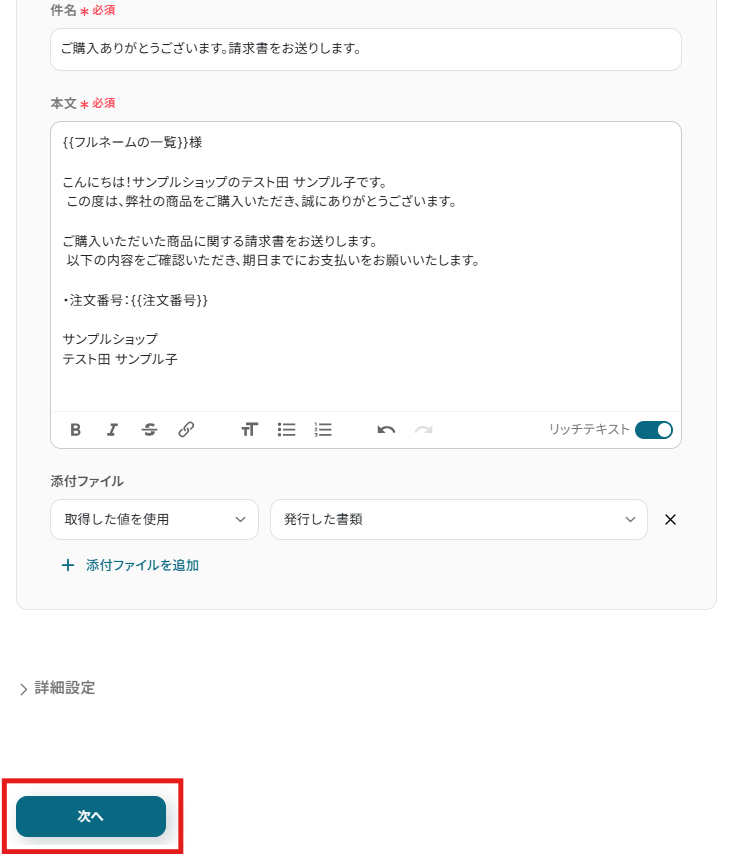 - 最後に、オペレーションで「メールを送る」アクションを設定し、作成した請求書ファイルを添付して顧客に送付します。