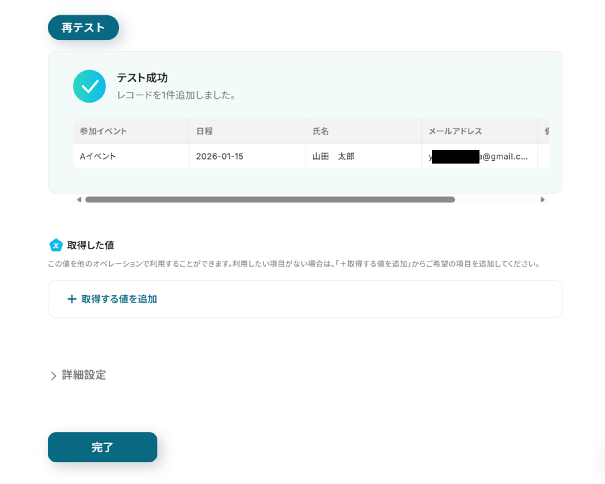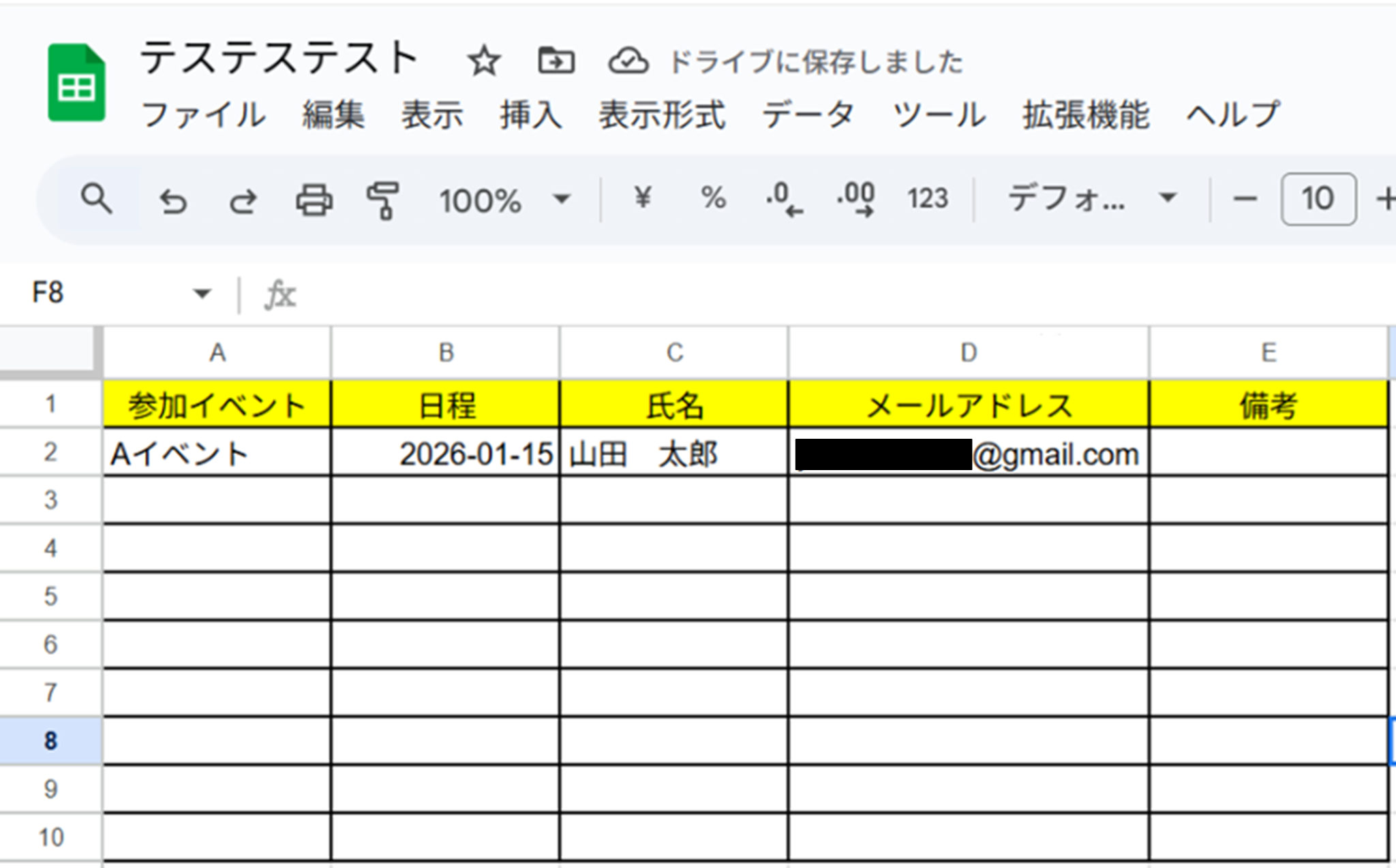 テストに成功すると、Google スプレッドシートにフォームの情報が反映されていました!
