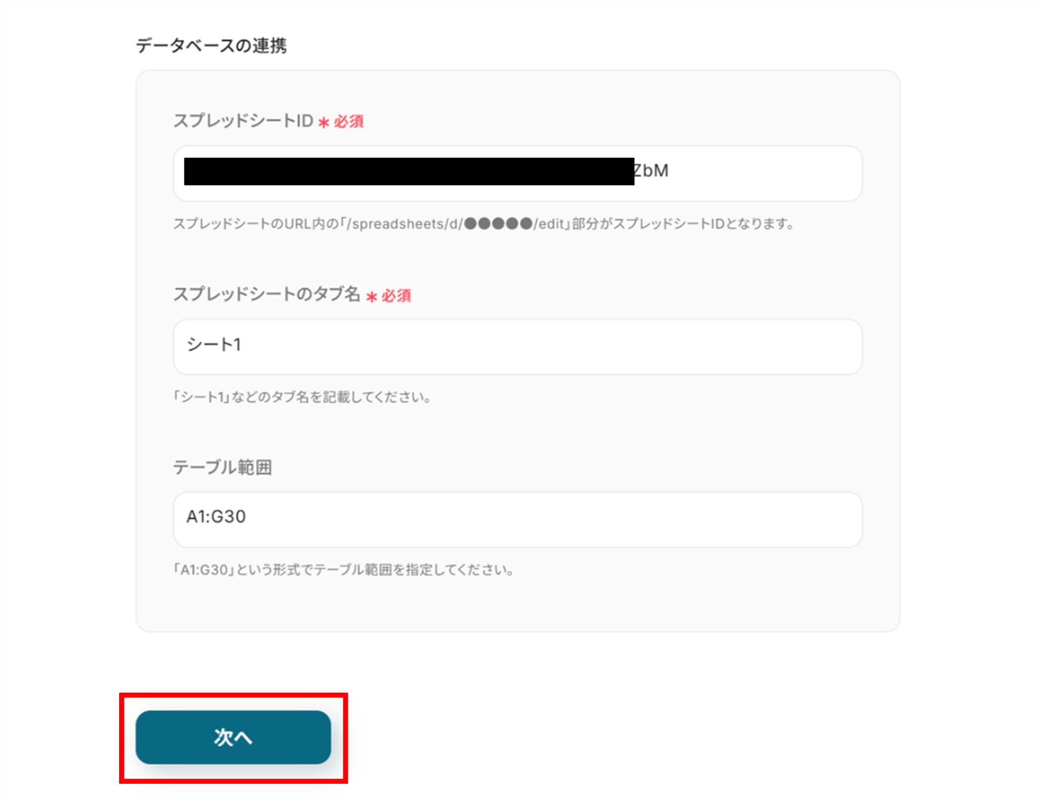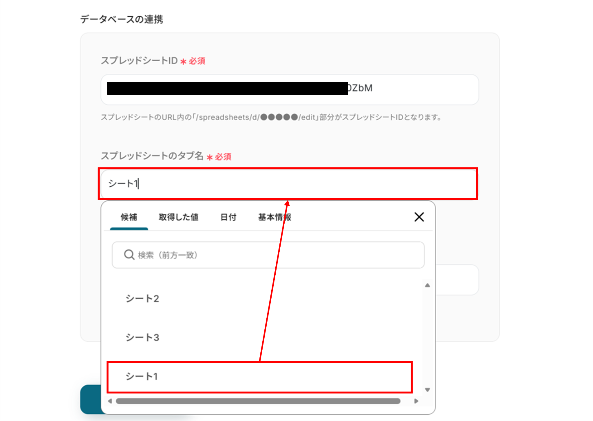 下へ進み、スプレッドシートIDとスプレッドシートのタブ名は候補から選択できます。