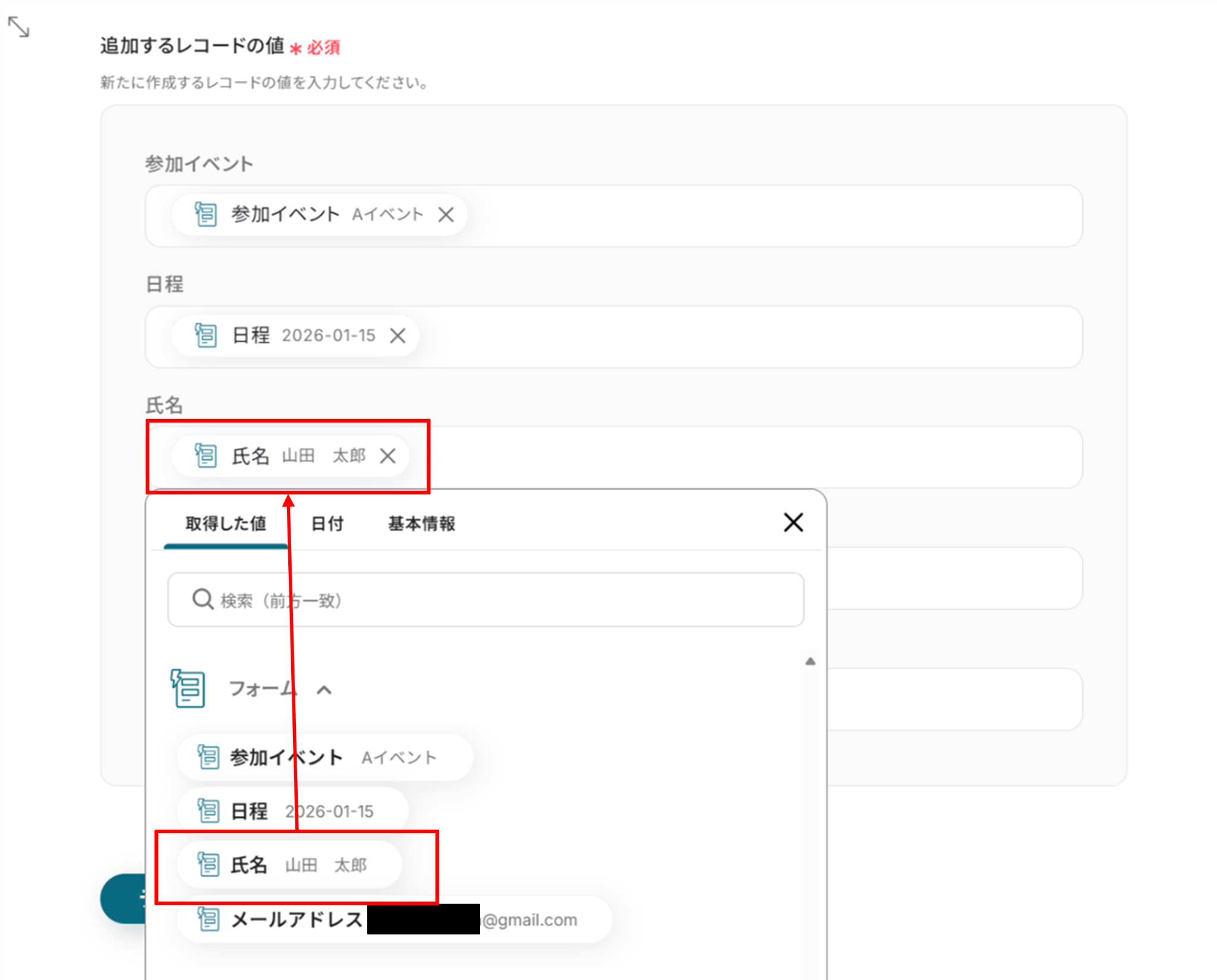 追加するレコードの値にフォームで取得した値を使って入力します。
