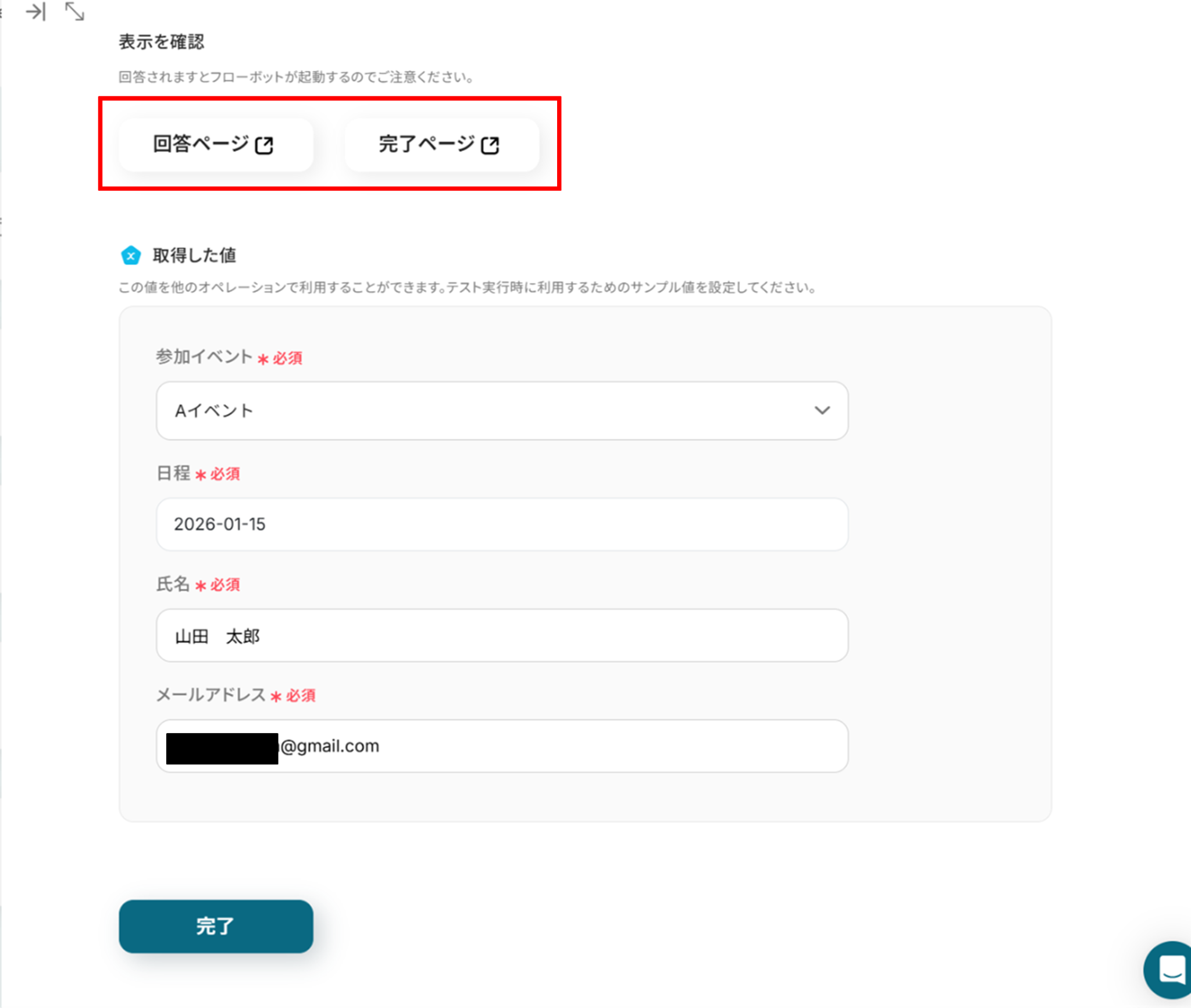 (3)赤枠より、作成したフォームと回答後の完了ページを確認することができます。