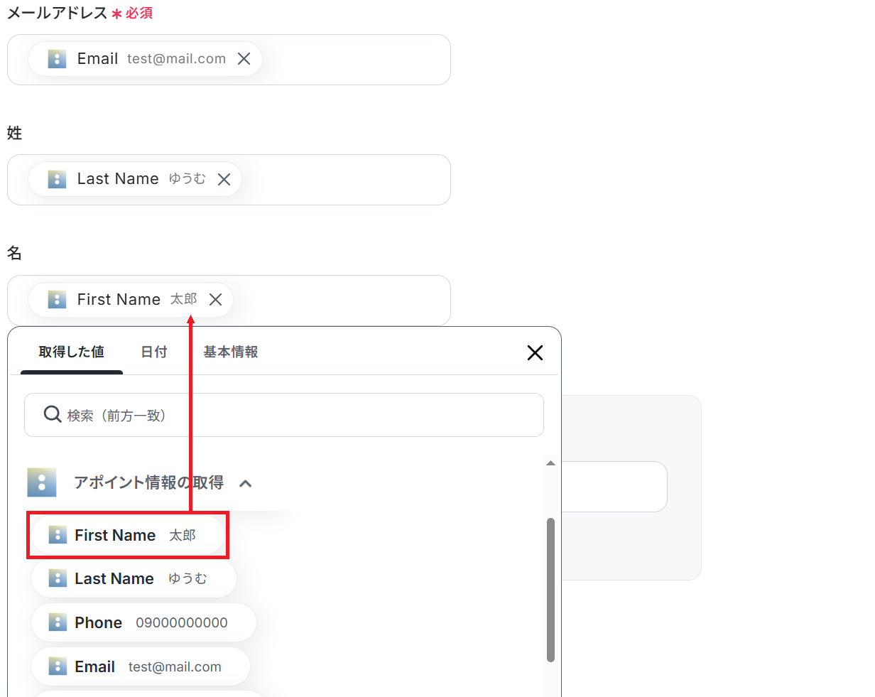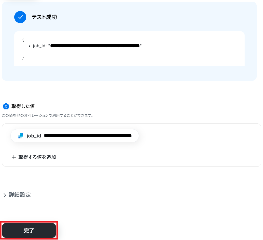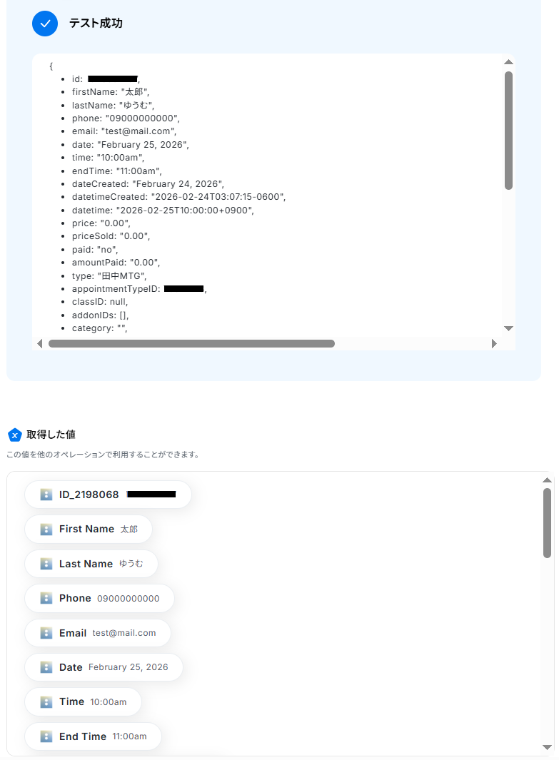 アポイントIDの欄には、トリガーで取得した「ID」の値が予め設定されているのでそのままテストしてください。