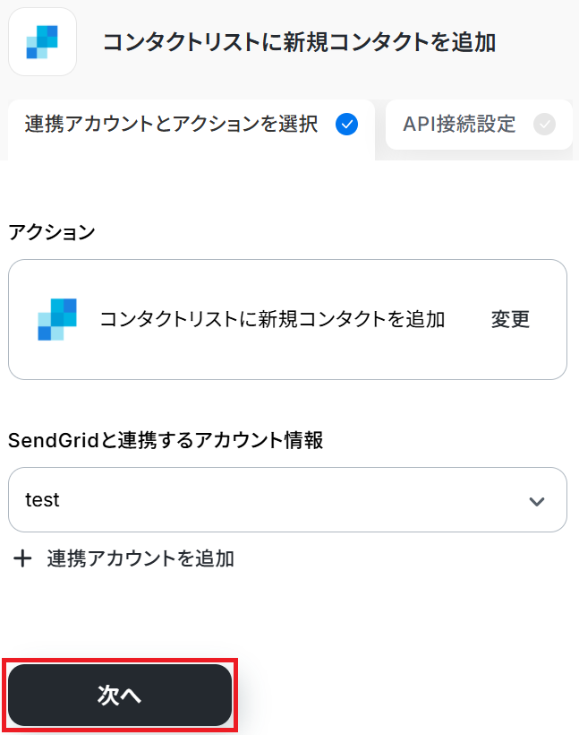 ステップ3・4と同様、アクションは「コンタクトリストに新規コンタクトを追加」のまま「次へ」をクリックします。