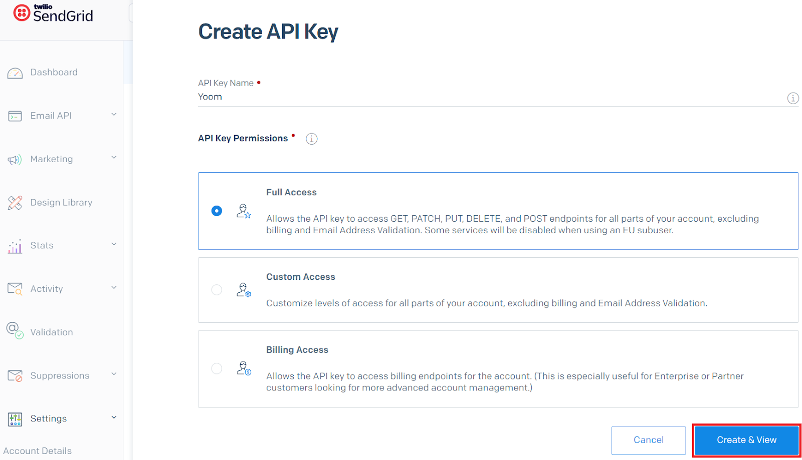 まず、SendGrid管理画面のSettingsからAPI Keysに進み「Create API Key」をクリックします。