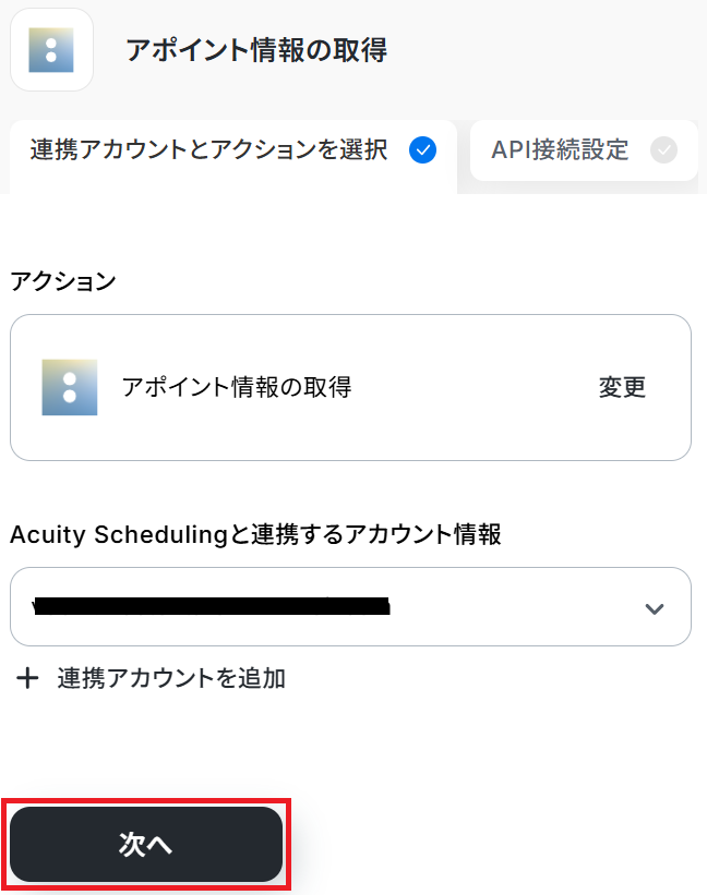 ステップ3と同様、アクションは「アポイント情報の取得」のまま「次へ」をクリックします。