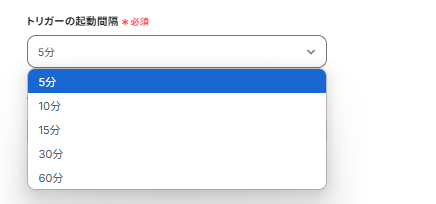 - トリガーは5分、10分、15分、30分、60分の間隔で起動間隔を選択できます。