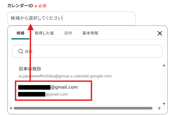 カレンダーIDは以下のように表示される候補から選択しましょう。