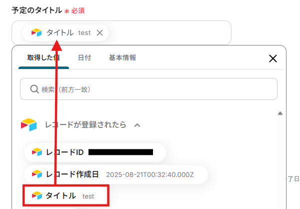 予定のタイトルを以下のようにAirtableから取得した値から入力しましょう。