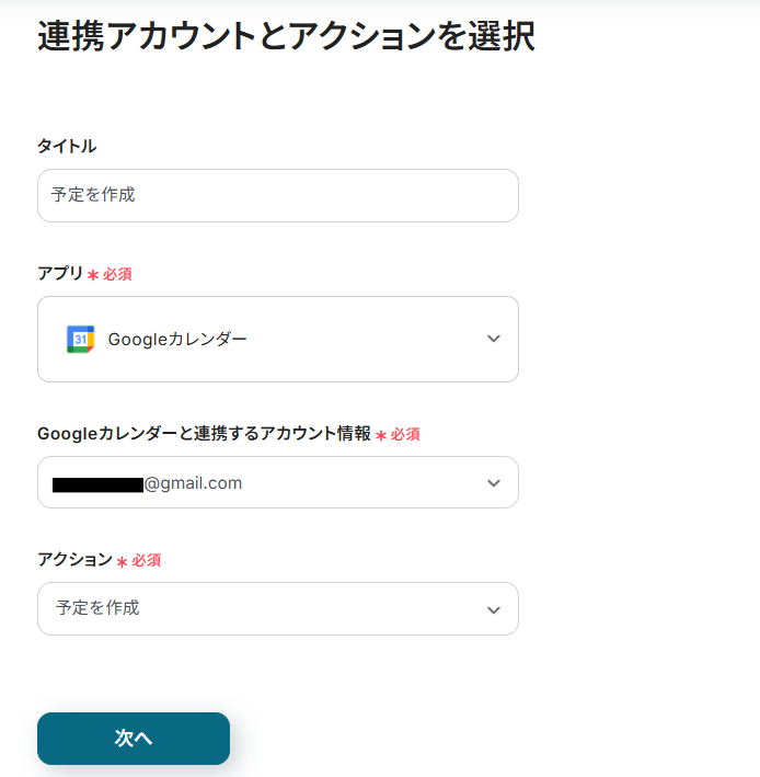 - 次に、オペレーションでGoogleカレンダーの「予定を作成」アクションを設定し、Airtableから取得した情報をもとに予定を作成します
