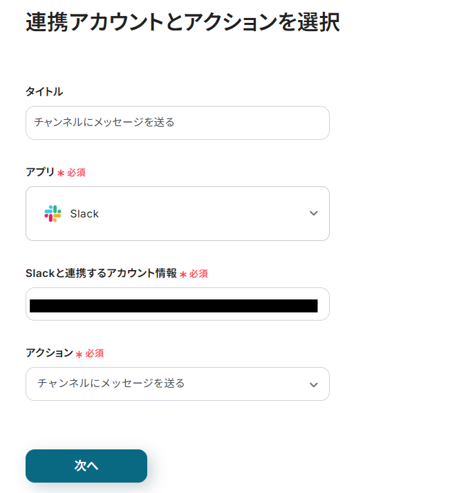 連携アカウントとアクションを選択する画面が表示されるので、今回連携するSlackのアカウントを確認し「次へ」をクリックします。