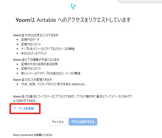 以下の画像のような画面が表示されるため、赤枠内の「ベースを追加」をクリックします。