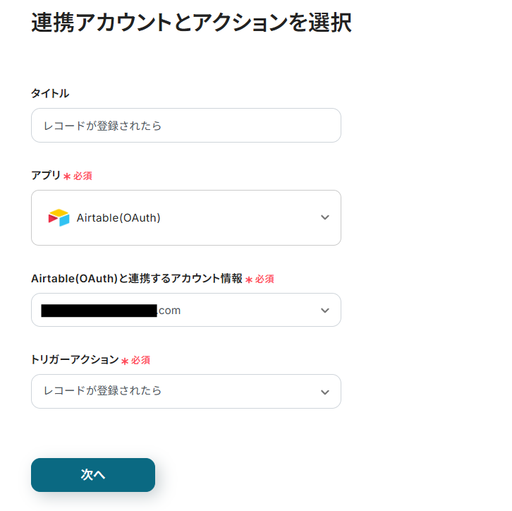 - 次に、トリガーでAirtableを選択し、「レコードが登録されたら」というアクションを設定します。