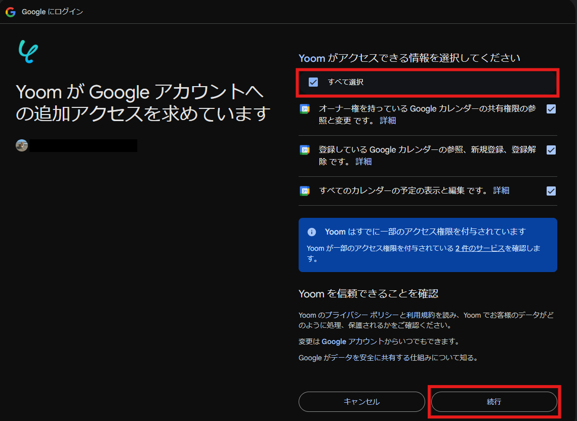 以下の画面が表示されるので、赤枠内の「すべて選択」をクリックし、「続行」をクリックします。