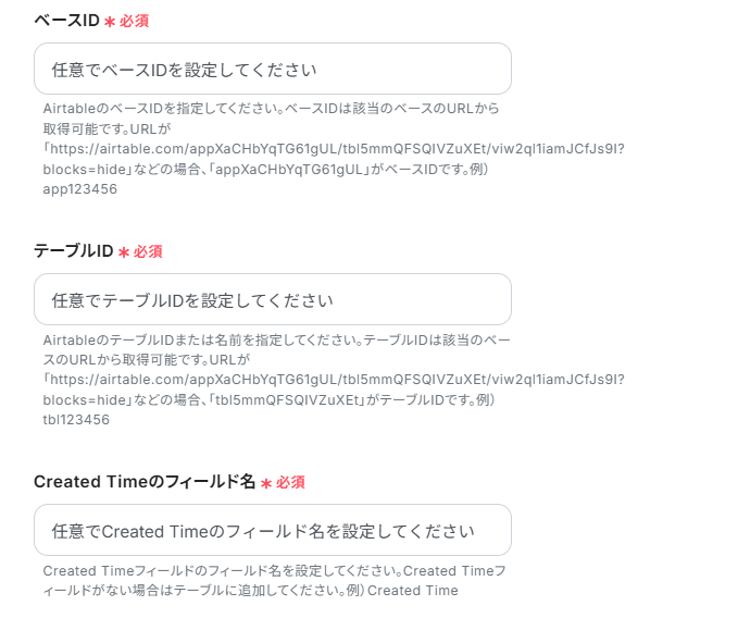 - Airtableのトリガー設定では、連携対象となるベースID、テーブルID、またレコード登録の判定基準となるCreated Timeのフィールド名を任意で設定してください