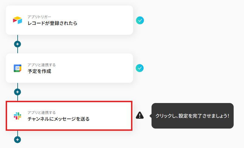 今回のフローではGoogleカレンダーのアクションを削除し、+ボタンから代わりにお使いのツールを追加し、設定してください。