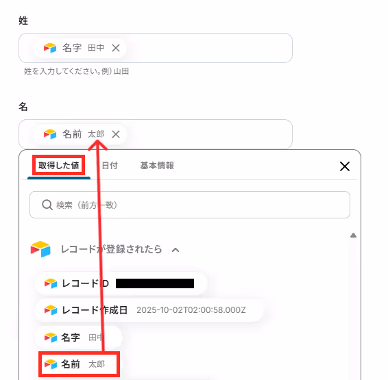 「姓」と「名」も、取得した値を活用して設定しましょう。