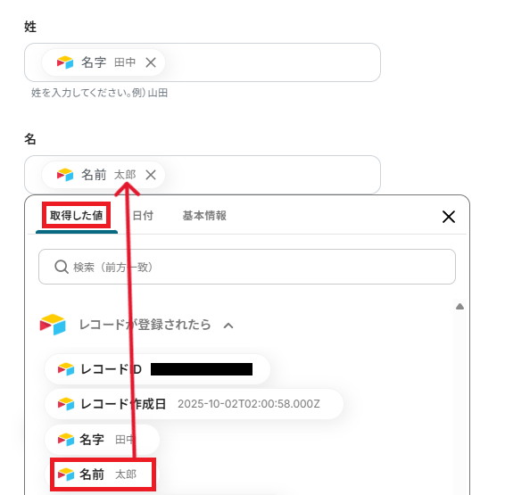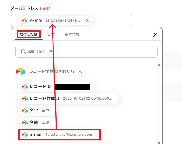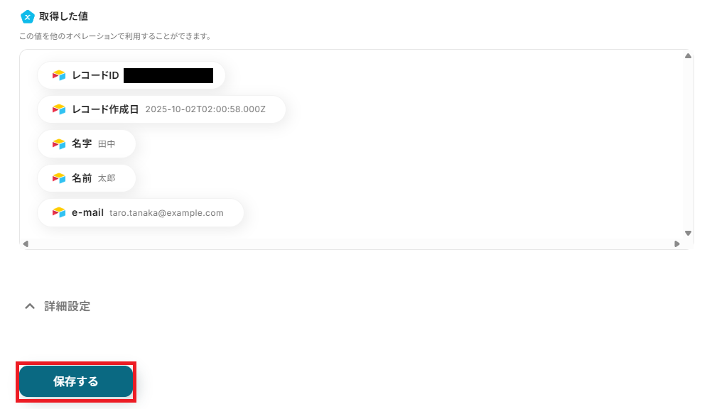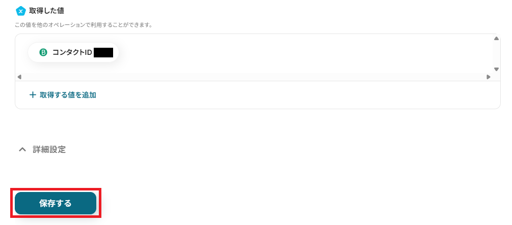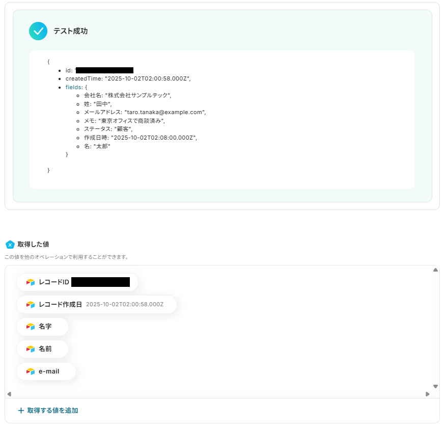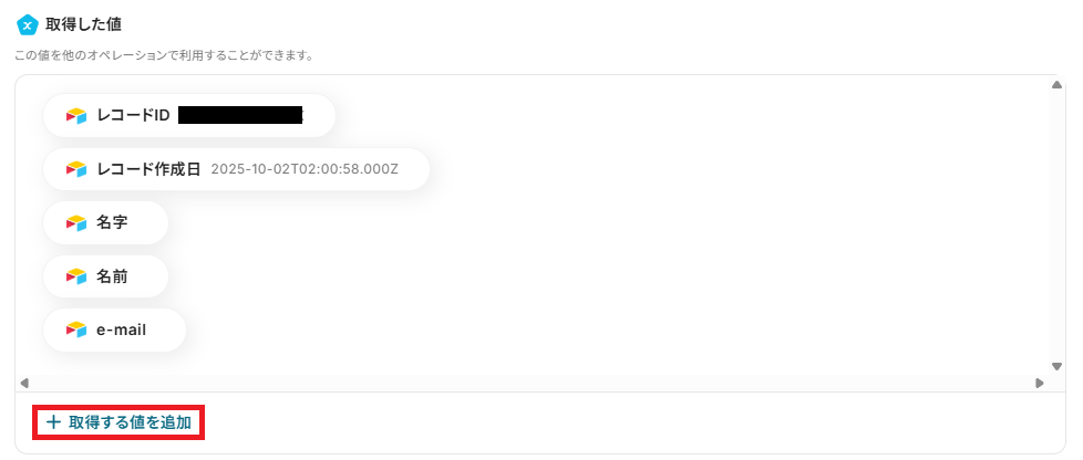 その場合は「+取得する値を追加」をクリックして、フィールド情報を取得しましょう。
