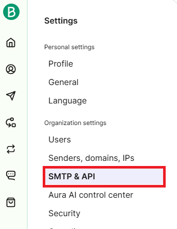 Brevoにログインし、Settingsから「SMTP&API」をクリックしてください。