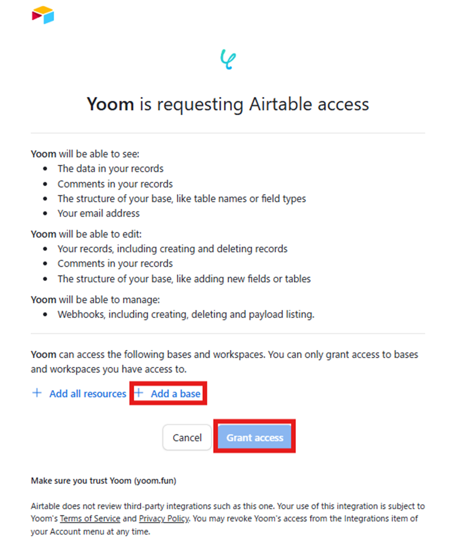 「+Add a base」からベースを追加し、「Grant access」を選択してください。