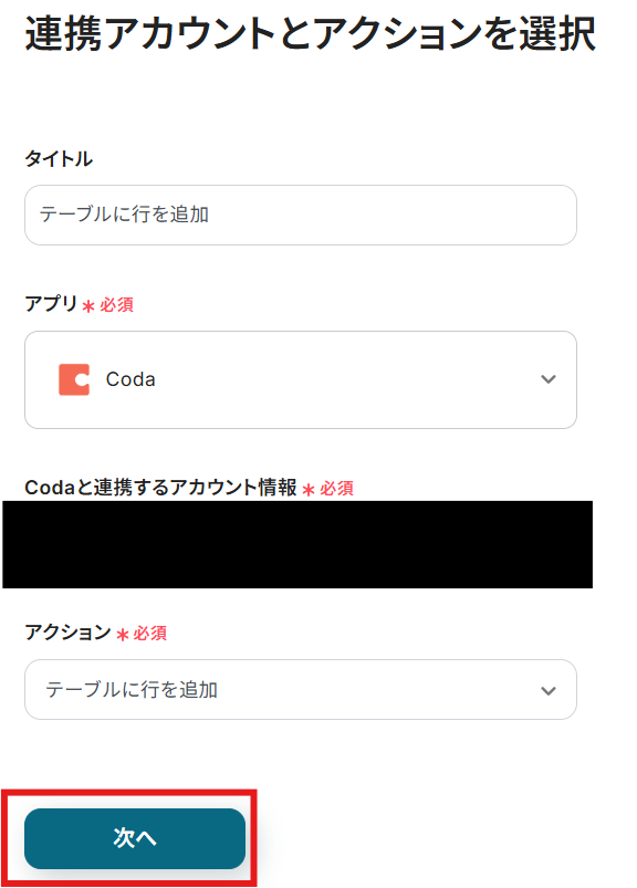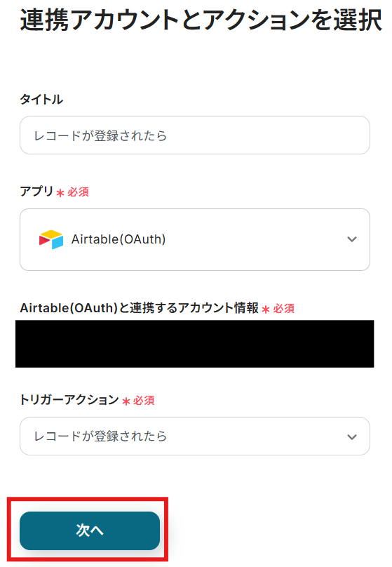 タイトルと連携するアカウント情報を確認し、アクションはテンプレート通りのまま「次へ」をクリックして進んでください。