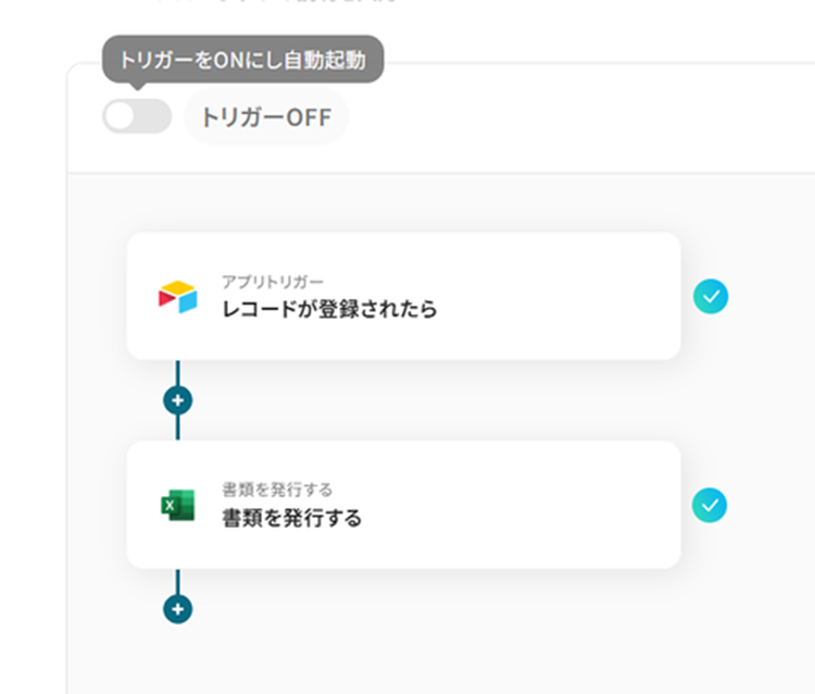 Airtableのトリガー直下に、「書類を発行する」オペレーションを追加し、Microsoft Excelで管理するフォーマットを設定してください。