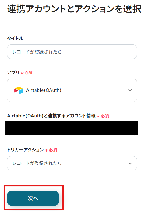 ステップ3:Airtableのトリガー設定(レコードが登録されたら)