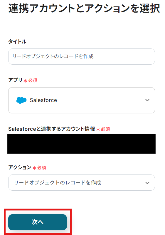 タイトルと連携するアカウント情報を確認し、アクションはテンプレート通りのまま「次へ」をクリックして進んでください。