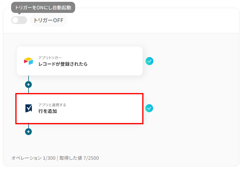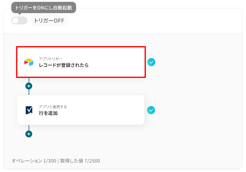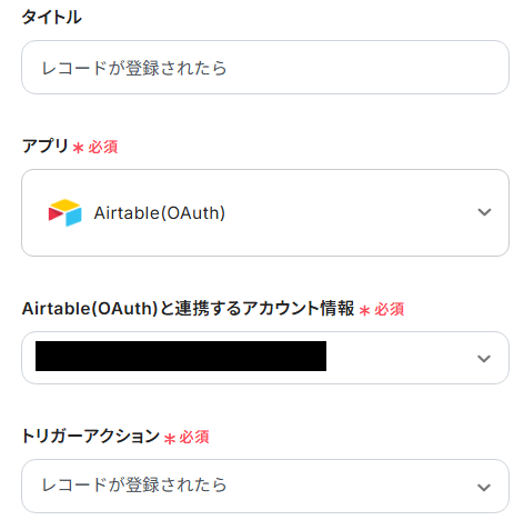- トリガーアクション:テンプレート通りに「レコードが登録されたら」のままでOKです。