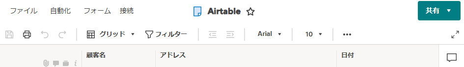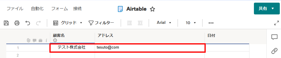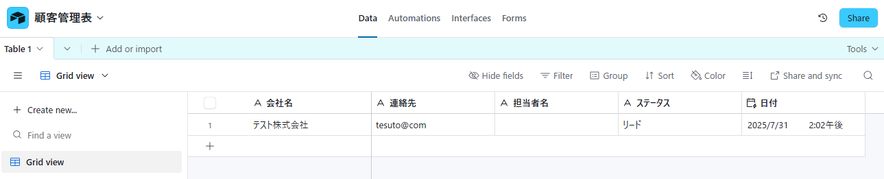 こちらの設定の前に、トリガーとなるAirtableの準備をしましょう。今回は、下記のようなテーブルを作成し、レコードを一行入力しました。(内容はテスト株式会社などの架空の情報でOKです)