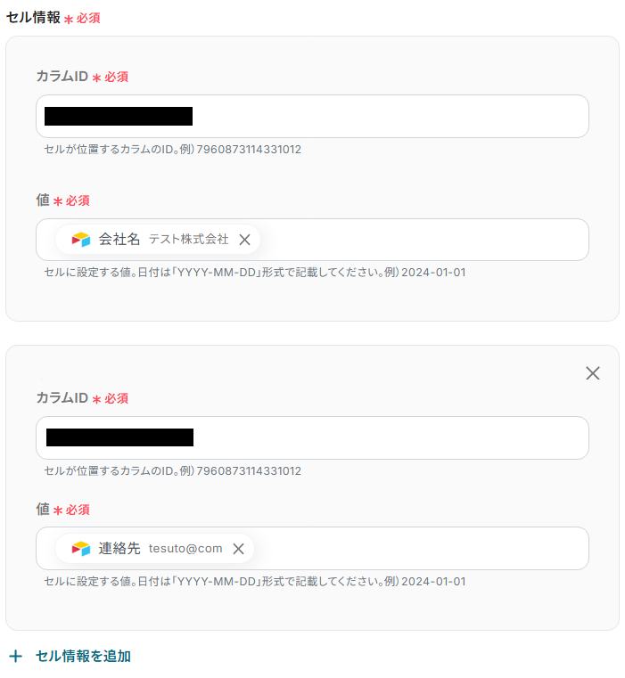 セルに反映させたい情報の数だけ、カラムIDと値を入力してください。(ページ最下部の「セル情報を追加」を押せば、入力欄を増やすことが出来ます)