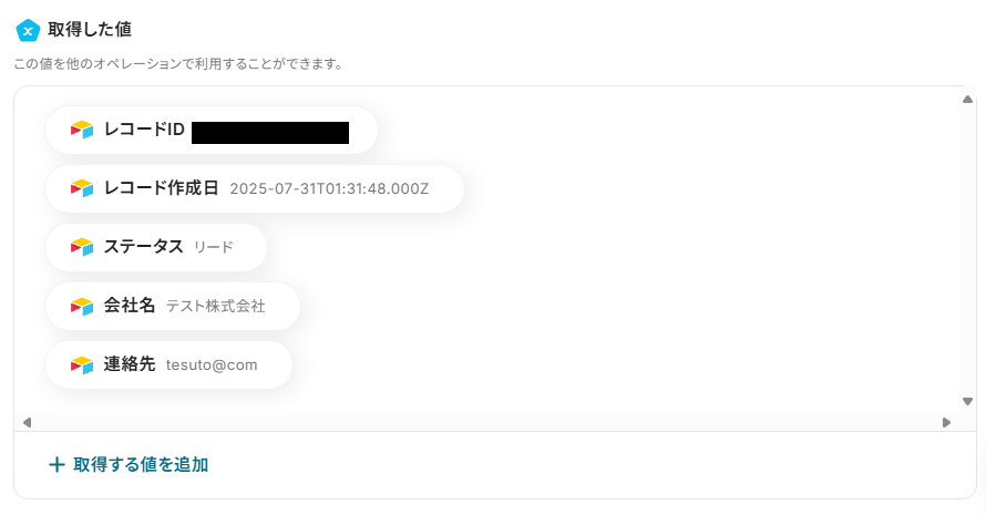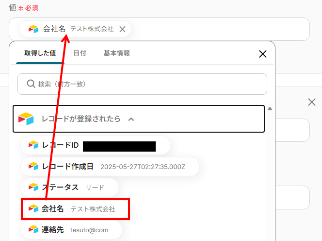- 値:入力欄を選択し、前のステップで取得したアウトプットを選びましょう。