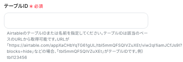 - テーブルID:ベースIDと同じようにAirtableのURLからコピーして入力しましょう。