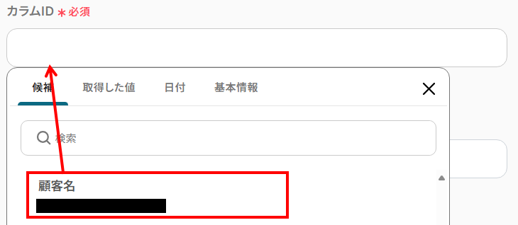 - カラムID:こちらも入力欄をクリックし、候補からデータを反映させたいカラムを選びましょう。