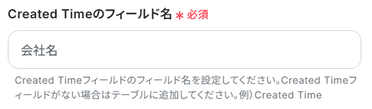- Created Timeのフィールド名:今回は事前に準備したテーブルに記載したフィールド名が「会社名」だったので、そちらを入力しました。先ほど準備したテーブルに記載のフィールド名を確認して入力しましょう。