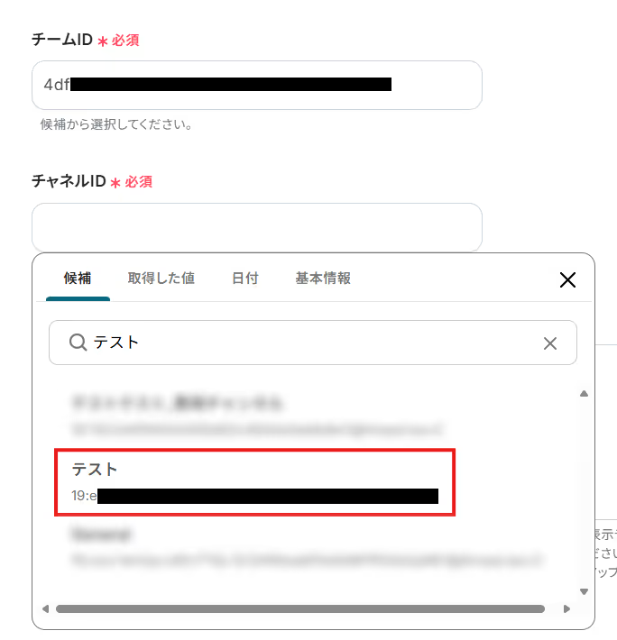 5.「チャネルID」の入力欄クリック時に表示される候補から、メッセージを送るチャネルを選択。