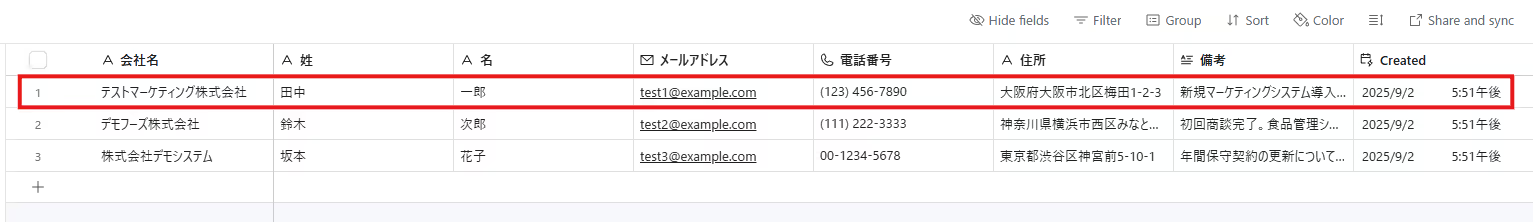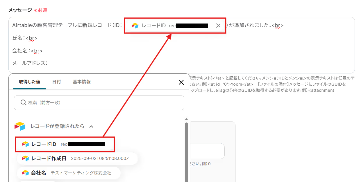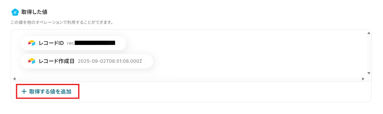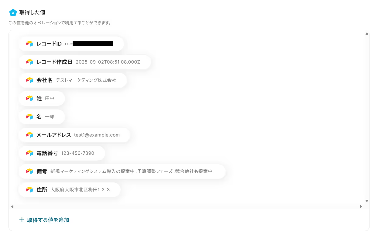 11.テストに成功すると、「取得した値」にレコードIDやレコード作成日などが追加されます。