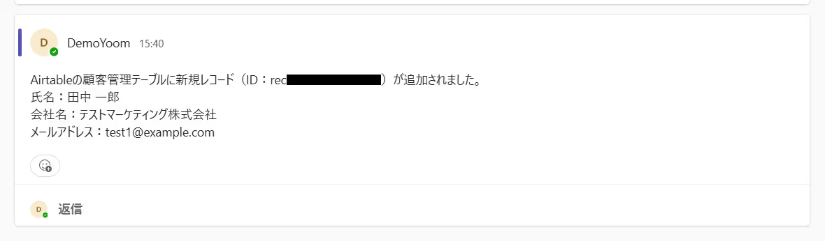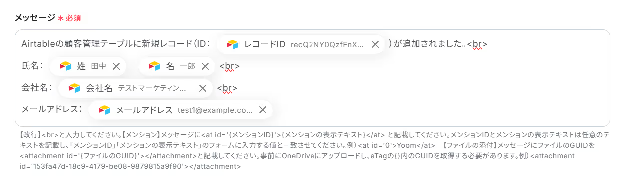 これにより、Airtableのレコードごとに変わる情報をMicrosoft Teamsへ動的に反映できます。