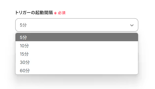 5.「トリガーの起動間隔」をプルダウンの「5分・10分・15分・30分・60分」から選択。