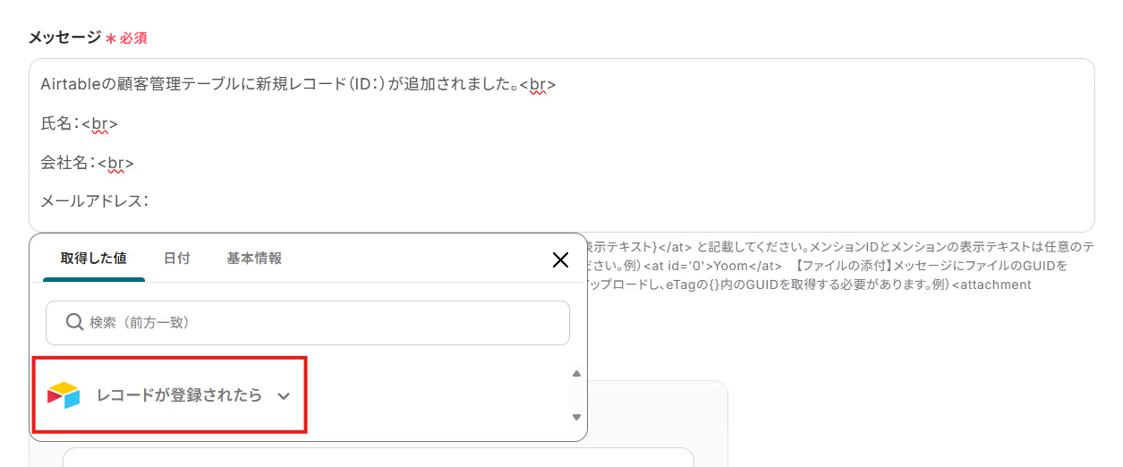 これらの動的な値と定型文を組み合わせて、レコードの作成を通知するメッセージを設定しましょう。